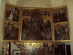Skrzydła boczne są zniszczone i zdekompletowane. Awers prawego skrzydła przedstawia Zwiastowanie i Narodzenie. Awers lewego: Nawiedzenie i Hołd Trzech Króli. Rewersy: legenda o św. Stanisławie: Wskrzeszenie Piotrowicza, Zabójstwo, Rozsiekanie zwłok świętego i Pogrzeb.