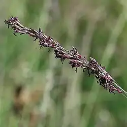 - Zebrane w kwiatostan – wąską, i długą wiechę, której gałązki wznoszą się prawie pionowo. Kłoski wybarwiają się na kolor brunatnofioletowy.