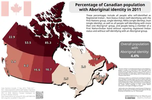 Według danych statystycznych z 2001 roku, w Kanadzie żyło ponad 900 tys. osób pochodzenia tubylczego (autochtonów), w tym 600 tys. Indian, 290 tys. Metysów i 45 tys. Inuitów, należących do ok. 630 uznanych formalnie przez władze ludów tubylczych.