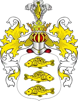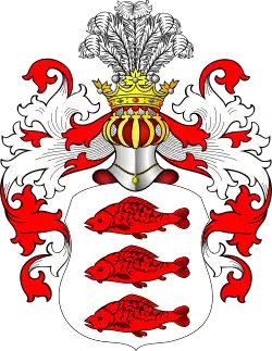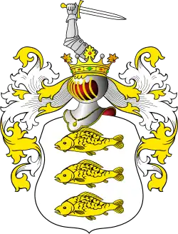 Tuchołka II: W polu srebrnym trzy karpie złote w słup, środkowy w lewo. Klejnot: nad hełmem w koronie trzy pióra strusie, na których karp złoty w dół. Labry srebrne, podbite złotem.