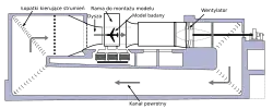 - Siły i momenty – dzięki odpowiedniej konstrukcji tunelu możliwe są też pomiary sił i momentów działających na model. Wykorzystywane jest to np. przy badaniu modeli samolotów na różnych kątach natarcia do wyznaczenia współczynników oporu i siły nośnej.