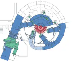 W turbinie Peltona dla zwiększenia sprawności stosuje się zamiast prostych łopatek specjalnie wyprofilowane łopatki na kształt dwóch połączonych czarek (dwie półkoliste sfery), na których strumień wody dużo łagodniej zmienia kierunek. Turbiny Peltona buduje się z wałami poziomymi i pionowymi. Przy wałach poziomych stosuje się max. dwie dysze wylotowe (przy większej ilości ze względu na zderzanie się strumieni z poprzedzającej dyszy moc maleje) a przy wałach pionowych do 6 dysz.