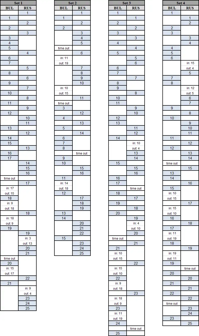 Do finału awansowały Brazylia i Rosja, w meczu o 3. miejsce zagrały natomiast Bułgaria i Włochy.