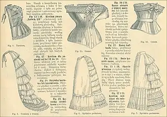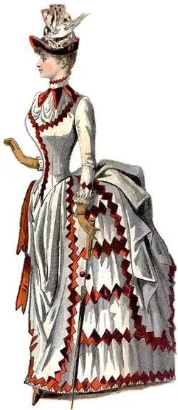 Kopulasty kształt spódnicy zaczął zmieniać się w połowie lat 60. XIX wieku – krynolina stała się mniejsza, jednocześnie wydłużając się z tyłu i tworząc tren. Ostatecznie znikła całkowicie na przełomie lat 60. i 70., zastąpiona przez turniurę; tył spódnicy zaczęły zdobić upinane draperie: spiętrzone fałdy podkreślane wstążkami. Kształt tyłowi sukni nadawał specjalny stelaż, wywodzący się początkowo ze stelaża krynolinowego. Stopniowo stelaż ten skracał się, aż pod koniec lat 70. ustąpił różnego rodzaju specjalnym konstrukcjom i poduszkom umieszczanym na pośladkach.