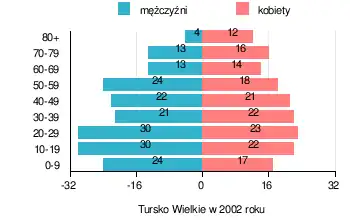Współczesna struktura demograficzna wioski Tursko Wielkie na podstawie danych z lat 1995–2009 według roczników GUS, z prezentacją danych z 2002 roku[c][22]: