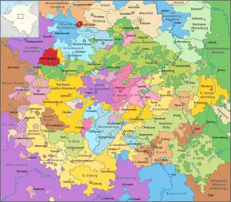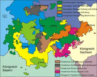 Ziemie Vogtlandu zostały z biegiem czasu rozdzielone pomiędzy Elektorat Saksonii oraz hrabstwo Reuss, z którego powstały księstwa Reuss linii starszej i linii młodszej. Hrabstwo Schwarzburg zostało podzielone w 1599 na hrabstwa Schwarzburg-Sondershausen i Schwarzburg-Rudolstadt, podniesione na przełomie XVII i XVIII w. do rangi księstw.