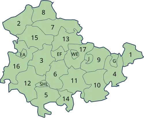Kraj związkowy dzieli się na powiaty ziemskie (Landkreis), których jest 17 oraz na pięć miast na prawach powiatu. Litery w nawiasach oznaczają skrót na tablicach rejestracyjnych pojazdów.