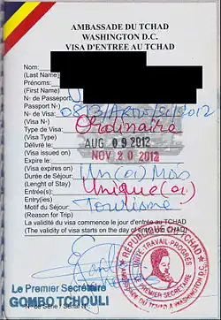 Turyści muszą mieć ważne paszporty i wizy, a także dowody szczepienia na żółtą gorączkę. Wizy pobytowe i tranzytowe obywatele mogą otrzymać w placówkach dyplomatycznych i konsularnych Czadu. Ważność paszportu przy wjeździe musi być dłuższa niż okres ważności wizy. Po przekroczeniu granicy Czadu podróżni są zobowiązani do dopełnienia formalności meldunkowych w ciągu 72 godzin[1].