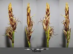 - W kątach rdzawych przysadek z zielonym grzbietem zebrane w kłosy. Kłos męski szczytowy jest wąski i prosto wzniesiony. Poniżej niego krótkie, skąpokwiatowe, kulistawe kłosy żeńskie. Kwiaty męskie z 3 pręcikami, kwiaty żeńskie ze słupkiem zakończonym trzema znamionami. Kwitnie od kwietnia do sierpnia.