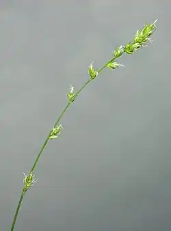- Zebrane w kłosy, przy czym kwiaty pręcikowe (męskie) znajdują się u ich szczytu, kwiaty słupkowe (żeńskie) znajdują się poniżej. W każdym kwiatostanie 6–8 kłosków zajmujących w sumie 5–8 cm długości łodygi, przy czym dolne kłoski są od siebie wyraźnie oddalone. Kwiaty wyrastają w kątach białawych przysadek. Kwiaty żeńskie ze słupkiem zakończonym dwoma znamionami. Kwitnie w maju i czerwcu.