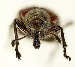 Ryjek ma smukłe czułki o luźnych buławkach umieszczone w połowie długości oraz wyraźne żeberko wzdłuż środka strony grzbietowej ciągnące się od nasad czułków do jego podstawy. U samca ryjek jest niewiele krótszy od głowy i przedplecza razem wziętych, u samicy zaś około półtora raza od nich dłuższy. Głowa jest za oczami, dużymi u samca i mniejszymi u samicy, rozszerzona ku tyłowi. Czoło jest wypukłe[4].