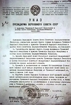 11 października 1944 r. kraj został wcielony do ZSRR jako Tuwiński Obwód Autonomiczny[4].