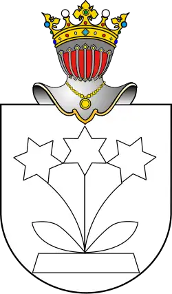 W polu belka na której między dwoma listkami trzy kwiaty w kształcie gwiazd na łodyżkach.