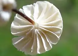 Białawe, mają regularną tramę, są bardzo szeroko rozstawione. Przy trzonie zrastają się tworząc wokół niego kołnierzyk[5].