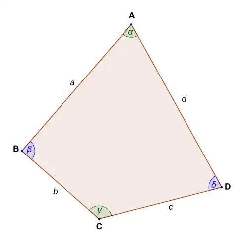{\displaystyle {\begin{aligned}|BD|^{2}&=b^{2}+c^{2}-2bc\cos \gamma \\|BD|^{2}&=a^{2}+d^{2}-2ad\cos \alpha .\end{aligned}}}