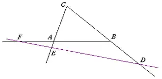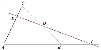 Dowolna poprzeczna wyznacza na dwóch bokach trójkąta i przedłużeniu trzeciego boku (lub na przedłużeniach wszystkich boków) punkty w ten sposób, że iloczyn długości trzech do siebie nieprzyległych odcinków jest równy iloczynowi długości trzech pozostałych, czyli[2]