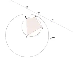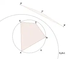 Niech dany będzie czworokąt wpisany w okrąg [6][7]. Niech dane będą również punkty oraz będące obrazami inwersyjnymi punktów względem nowego okręgu o środku w punkcie i pewnym promieniu Ponieważ punkty leżą na okręgu który przechodzi przez środek okręgu to ich obrazy i będą współliniowe[8]. Wynika stąd, że