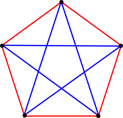 Aby znaleźć na przykład wartość R(3,3), kolorujemy krawędzie grafów pełnych dwoma kolorami (np. czerwonym i niebieskim), szukając najmniejszego grafu pełnego, dla którego przy dowolnym kolorowaniu znajdziemy albo trójkąt czerwony, albo trójkąt niebieski. Okazuje się, że R(3,3)=6. Dowód: wybierzmy dowolny punkt grafu pełnego o sześciu wierzchołkach. Wychodzi z niego pięć krawędzi, więc przynajmniej trzy mają wspólny kolor. Załóżmy bez utraty ogólności, że są to trzy czerwone krawędzie (sytuacje te charakteryzują się pełną symetrią). Krawędzie te prowadzą do trzech różnych punktów; te trzy nowe punkty są połączone między sobą trzema krawędziami. Jeżeli choć jedna z nowych krawędzi jest czerwona, powstaje czerwony trójkąt, w przeciwnym przypadku powstaje niebieski trójkąt. Wobec tego R(3, 3) nie może być większe od 6. Rysunek po lewej dowodzi, że nie może być równe 5 ani mniejsze, więc istotnie jest równe 6. Ma to bardzo wygodną interpretację, mianowicie w zbiorze 6 osób zawsze znajdziemy 3 osoby znające się wzajemnie lub 3 osoby, które się nie znają.