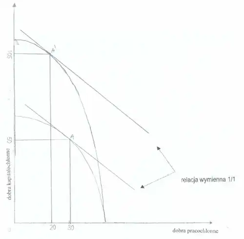 W momencie, gdy zasoby pracy wzrosną, np. w wyniku napływu siły roboczej z zagranicy, zmieniają się możliwości produkcyjne omawianego kraju. Ukształtuje się nowa krzywa możliwości produkcyjnych położona dalej od początku układu współrzędnych. Widać, że jest ona bardziej spłaszczona w kierunku dóbr pracochłonnych a punkt równowagi produkcyjnej przesuwa się do A’, w którym produkcja dóbr pracochłonnych wzrasta z 50 do 105 a dóbr kapitałochłonnych spada z 30 do 20.