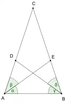 - Jeżeli w trójkącie długości dwóch dwusiecznych są równe, to trójkąt jest równoramienny.