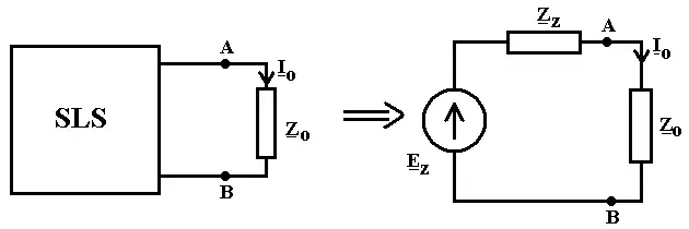 - Zz – impedancja zastępcza, równa impedancji układu (z wyłączonymi źródłami autonomicznymi) widzianej z zacisków AB