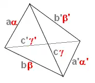 Jeśli a, b, c, a′, b′, c′ są długościami krawędzi czworościanu przy czym primowane leżą naprzeciw odpowiednich nieprimowanych, oraz jeśli α, β, γ, α', β', γ' są kątami krawędziowymi przy analogicznych krawędziach, to