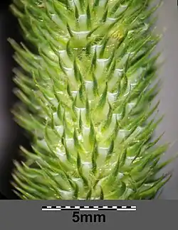 - Zebrane w walcowatą wiechę o bardzo krótkich gałązkach, przez co przypomina swoim wyglądem kłos. Wiecha ma długość zwykle do 12 cm, rzadziej nawet ponad 30 cm i grubość 4-12 mm, jest sztywna i zielona (czasami podbarwiona na fioletowo), żółto- lub szarozielona. Kłoski są jednokwiatowe, długości nieco ponad 3 mm. Plewy ok. 3 mm długości z wyrostkami ościstymi do 2,5 mm długości. Na szczycie są poprzecznie ucięte, nie wygięte, z prostą, orzęsioną linią grzbietową. Plewki błoniaste, spiczaste, gęsto pokryte włoskami[5]. Pylniki mają żółty lub fioletowy kolor, a znamiona słupka są wachlarzowate lub piórkowate. Kwitnie w czerwcu-lipcu.