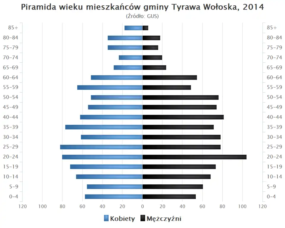 - Piramida wieku mieszkańców gminy Tyrawa Wołoska w 2014 roku[13].