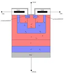 Podobnie jak tranzystory polowe mocy MOSFET, również tyrystory MCT mają budowę komórkową. W jednej konstrukcji monolitycznej, wykonanej w technice scalonej, jest duża liczba równolegle połączonych identycznych komórek, np. element 100 A, 1000 V ma 105 elementów. Element ten obecnie znajduje się w fazie rozwojowej i dlatego trudno wyrokować o jego przyszłych zastosowaniach.