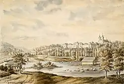 - Widok Tywrowa z pałacem Jaroszyńskich na rysunku Napoleona Ordy