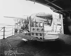 Pokład startowy obsługiwany był przez trzy umieszczone w osi okrętu windy o wymiarach 48 × 44 stopy (14,4 × 13,4 metra) – jedna w części dziobowej jednostki, druga tuż za wyspą nadbudówki, trzecia zaś w części rufowej[16]. Na dziobie okrętu umieszczono także dwie przyśpieszające start samolotów hydrauliczne katapulty, trzecia zaś umieszczona została na pokładzie hangarowym[16].