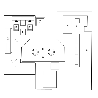 1. Panel kontroli okrętu, 2. Panel sterowania i kontroli balastem, 3. Centrum ESM, 4. Stanowisko peryskopów, 5. Stół nawigacyjny, 6. Panel systemu kontroli ognia, 7. Właz do mostka.