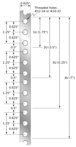 Z tego wynika, że moduł 2U ma wysokość 3,5″, tj. 88,9 mm, stojak połówkowy (ang. half-size, half-height) 22U ma przestrzeń montażową o wysokości 977,9 mm, a w stojaku pełnowymiarowym (ang. full-size) 42U przestrzeń na urządzenia wynosi 1866,9 mm. Najczęściej wykorzystywanymi rozmiarami modułów są 1U do 4U.