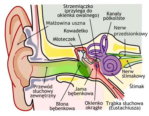 - Okienko owalne (przedsionka) – błona stykająca się bezpośrednio ze strzemiączkiem, ułatwiająca przejście drgań z ucha środkowego do wnętrza ślimaka. Drgania przechodzą do schodów przedsionka, czyli zewnętrznej komory ślimaka.