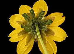 - Zebrane w zwieszone koszyczki kwiatowe. Listki okrywy zewnętrznej w liczbie 5–8, osiągają do 2 cm długości i 0,5 cm szerokości, w czasie kwitnienia są rozpostarte, w czasie owocowania zwykle wzniesione. Okrywa wewnętrzna to 8 jajowatych i błoniastych listków, pomarańczowo zabarwionych na szczycie, osiągających do 9 mm długości. Na dnie koszyczka występują podobne do nich, choć węższe plewinki. Na brzegu koszyczka występują zwykle kwiaty języczkowate barwy złotożółtej[6] w liczbie do 8, osiągające do 1,5 cm długości[7]. Kwiaty rurkowate wewnątrz koszyczków są także żółte, ale drobne[6].