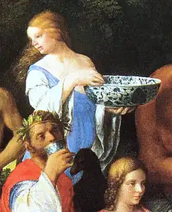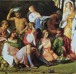 Na płótnie od lewej strony przedstawieni są: Sylen (bóg lasu), Bachus (w postaci dziecka z liściem laurowym na głowie), Silvanus (stary bóg lasu z wieńcem z igieł sosnowych), Merkury (posłaniec bogów), Jupiter, Persefona (z owocami pigwy symbolizującymi w starożytności małżeństwo), Pan, Neptun, Ceres (z wieńcem pszenicy), Apollo (pijący wino z czary, bóg słońca i sztuk). Ostatnimi postaciami są Priapus i Lotis.