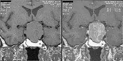 ![]() Udar przysadki, w przebiegu którego wystąpiły bóle głowy i utrata wzroku u 43-letniego mężczyzny. W centrum obrazu RM w sekwencji T1 widoczna jest masa przemieszczająca skrzyżowanie wzrokowe | |