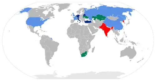 NPT – państwa posiadające broń jądrową zgodnie z ustaleniami międzynarodowymi (Chiny, Francja, Rosja, Wielka Brytania, Stany Zjednoczone)