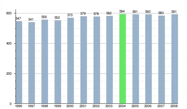 Według danych z dnia 31 grudnia 2012, wieś zamieszkiwało 557 osób, w tym 269 kobiet i 288 mężczyzn[6].