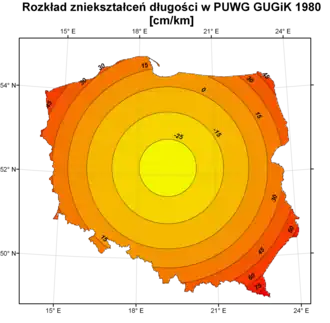 Zniekształcenia układu wynoszą od –29 cm/km w punkcie głównym i rosną do +90 cm/km u źródeł Sanu. Układ stanowił podstawę do sporządzania map w skalach 1:100 000 i mniejszych. Układ ten znalazł zastosowanie w praktyce jedynie przy opracowaniu wydawanej w latach 1980–1984 topograficznej mapy Polski w skali 1:100 000[1].
