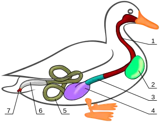 1 – przełyk, 2 – wole, 3 – żołądek gruczołowy, 4 – żołądek mięśniowy, 5 – jelito cienkie, 6 – jelito grube, 7 – kloaka