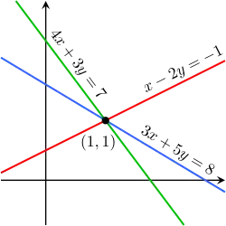 W geometrii euklidesowej można rozpatrywać miejsca geometryczne wyznaczone przez dane dwie proste na płaszczyźnie – mogą one wyznaczać prostą, punkt lub nie wyznaczać żadnego miejsca geometrycznego; odpowiada im odpowiednio nieskończony zbiór elementów, zbiór złożony z pojedynczego elementu lub zbiór pusty. Wprowadzenie na płaszczyźnie układu współrzędnych umożliwia algebraizację tego zadania: proste zadane są za pomocą równań liniowych, zaś miejsce geometryczne wyznaczone przez te proste odpowiada zbiorowi elementów spełniających wszystkie równania jednocześnie (pełną interpretację geometryczną można znaleźć w sekcji Uogólnienia).