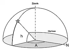 Azymut astronomiczny, A – kąt dwuścienny zawarty pomiędzy półpłaszczyzną lokalnego południka a półpłaszczyzną wertykału przechodzącego przez dany obiekt.