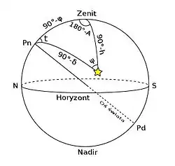 Rysunek ilustrujący transformację pomiędzy horyzontalnym a równikowym godzinnym układem współrzędnych (Pn i Pd oznaczają północny i południowy biegun świata). Azymut liczony klasycznie (od południa).