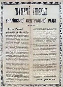 Po rozpędzeniu 5 stycznia?/18 stycznia 1918 w Piotrogrodzie przez bolszewików wybranej w demokratycznych wyborach Konstytuanty Rosji 9 stycznia?/22 stycznia 1918 roku Ukraińska Centralna Rada ogłosiła ona swój IV Uniwersał – deklarację niepodległości Ukrainy: „od dzisiaj Ukraińska Republika Ludowa staje się niepodległym, od nikogo niezależnym, wolnym, suwerennym Państwem Narodu Ukraińskiego”[2].