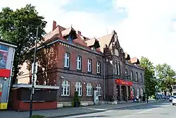 - Budynek poczty z budynkiem gospodarczym (ul. Śląska 26)[63] – gmach wzniesiony w 1895 roku, rozbudowany w 1913 roku według proj. berlińskiego architekta Rorae’a; obiekt posiada cechy stylu neogotyckiego; pierwotnie posiadał stajnie i powozownie w podwórzu[23],