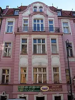 | 9. | Cieszkowskiego 9 | 1900–1902 | Karl Bergner | eklektyzm, secesja | pierwszym właścicielem był kupiec Ephreim Moritz; dekoracja zawiera w zwieńczeniu alegoryczne, płaskorzeźbione postacie kobiet z atrybutami – sową i kogutem, personifikacjami Dnia i Nocy | ![]() | |