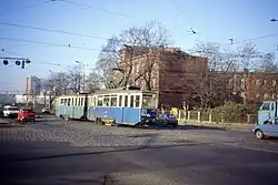 - ↑ Tramwaj jadący ulicą Dyrekcyjną od ulicy Ślężnej w 1989 r. Widoczne skrzyżowanie ulicy Dyrekcyjnej z ulicą Borowską. Ówcześnie tory tramwajowe przebiegały wzdłuż całej ulicy Dyrekcyjnej, a linia 19 była jedną, która kursowała na odcinku od ulicy Borowskiej do ulicy generała Kazimierza Pułaskiego[50]. W tle widoczny budynek szkoły.