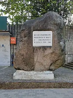 U zwieńczenia ulicy, przed stadionem, znajduje się głaz narzutowy, umiejscowiony tam 14 maja 1926 roku. W tym miejscu planowano ustawienie pomnika upamiętniającego stulecie powstania kąpieliska w Sopocie, lecz ostatecznie nie doszło do tego[12]. W latach 1965–1985 głaz zmienił położenie: został przeniesiony przed gmach Wyższej Szkoły Ekonomicznej, gdzie poświęcono go „Polakom pomordowanym przez Niemców za walkę o polskość ziem piastowskich i przynależność do Polskiego Związku Zachodniego”. W 1985 roku ponownie znalazł się na ulicy Wybickiego[13]. Obecnie na głazie znajduje się tablica poświęcona sportowcom zamordowanym podczas II wojny światowej[14].