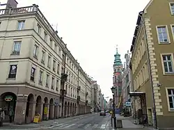 Jedną stronę ulicy, na całej jej długości zajmuje, socrealistyczny w stylu, mieszkalny budynek z podcieniami o numerze 7/9, a po drugiej stronie znajduje się szereg kamienic odbudowanych po 1945 roku, wraz z budynkiem Wielkiej Zbrojowni.